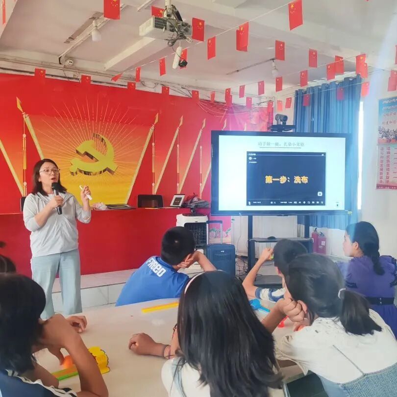 活动现场,物理与电子工程学院教师第一党支部“三人行”党小组成员邹艳波、李舒园和张志忠老师,校团委暑期“三下乡”社会实践团成员共同带领孩子们一起完成了扎染和流速与压强的关系系列实验,并讲解了其中蕴含的科学原理。