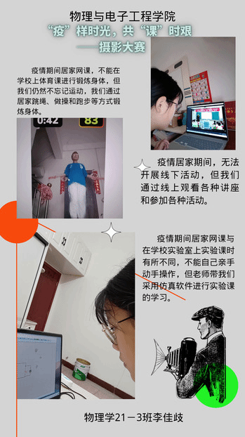 因为疫情,同学们又回到了线上课堂,现在居家上网课相对于之前坐在教室上课,同学们内心有着不一样的感受。为更好地发挥学院在心理健康教育工作中的主体作用,营造良好的校内心理健康教育活动氛围,切实落实2022年心育通知[2022]3号要求,根据心理健康服务中心2022年秋季学期活动安排,我院于10月26日-11月6日组织举办了“‘疫’样时光,共‘课’时艰”主题摄影大赛,以深化我院心理育人工作,将心理健康教育工作落实到“育人”上来,培养学生乐观向上、理性平和的心态。