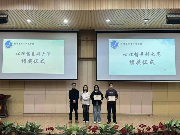 为深化心理健康教育内涵,创新思政育人形式,通过戏剧表演的形式,引导学生关注心理健康,传递积极向上的价值观,促进学生的全面发展。3月27日,物理与电子工程学院在国际教育大厦三楼报告厅举办“‘剧’焦青春,演绎成长”心理情景剧大赛。校党委学生工作部心理健康教育服务中心闫孟婕、学院心理健康专干范佳薇、辅导员周丽茹、研究生代表杨天奇担任评委,学生代表200余人参与。