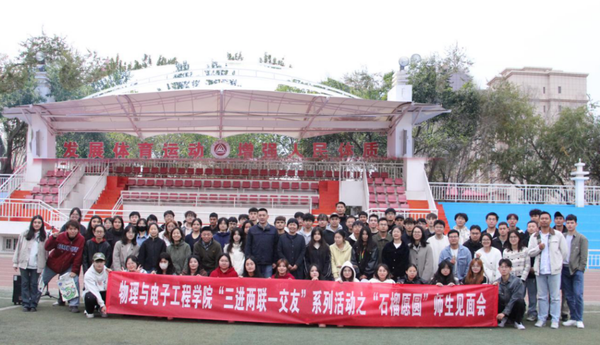 为激励广大师生做新时代民族团结进步的践行者、促进者、守护者,不断促进各族师生交往、交流、交融,将“三进两联一交友”活动推向深入。10月16日,物理与电子工程学院在昆仑校区田径场组织开展了“三进两联一交友”系列活动“石榴愿圆”师生见面会,学院领导、辅导员、班主任、相关机关干部教师和联系学生共计100余人参加此次活动。活动由学院辅导员周丽茹主持。